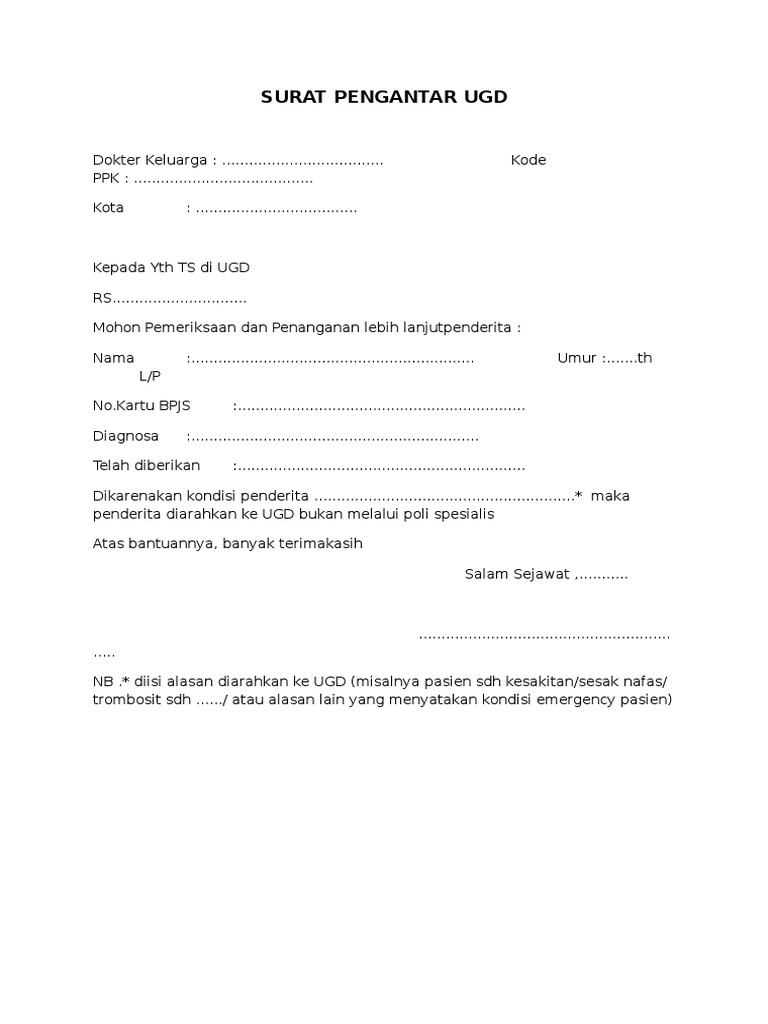 Surat Pengantar UGD adalah surat yang diberikan oleh Puskesmas atau Klinik Pratama kepada pasien yang membutuhkan penanganan medis lebih lanjut di rumah sakit. Surat ini berisi informasi tentang kondisi pasien dan kebutuhan penanganan medis yang harus diberikan.